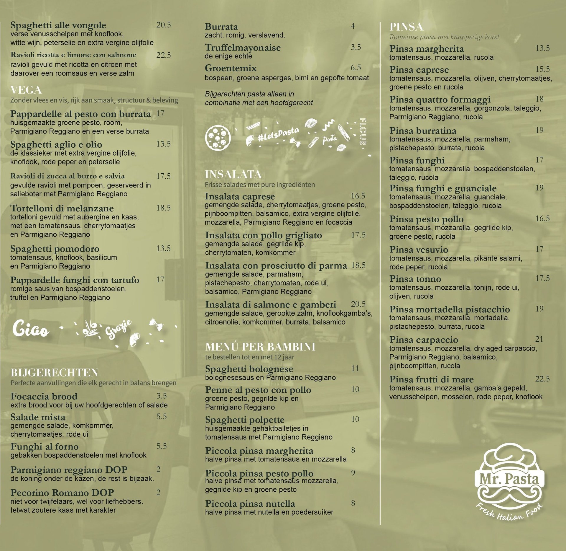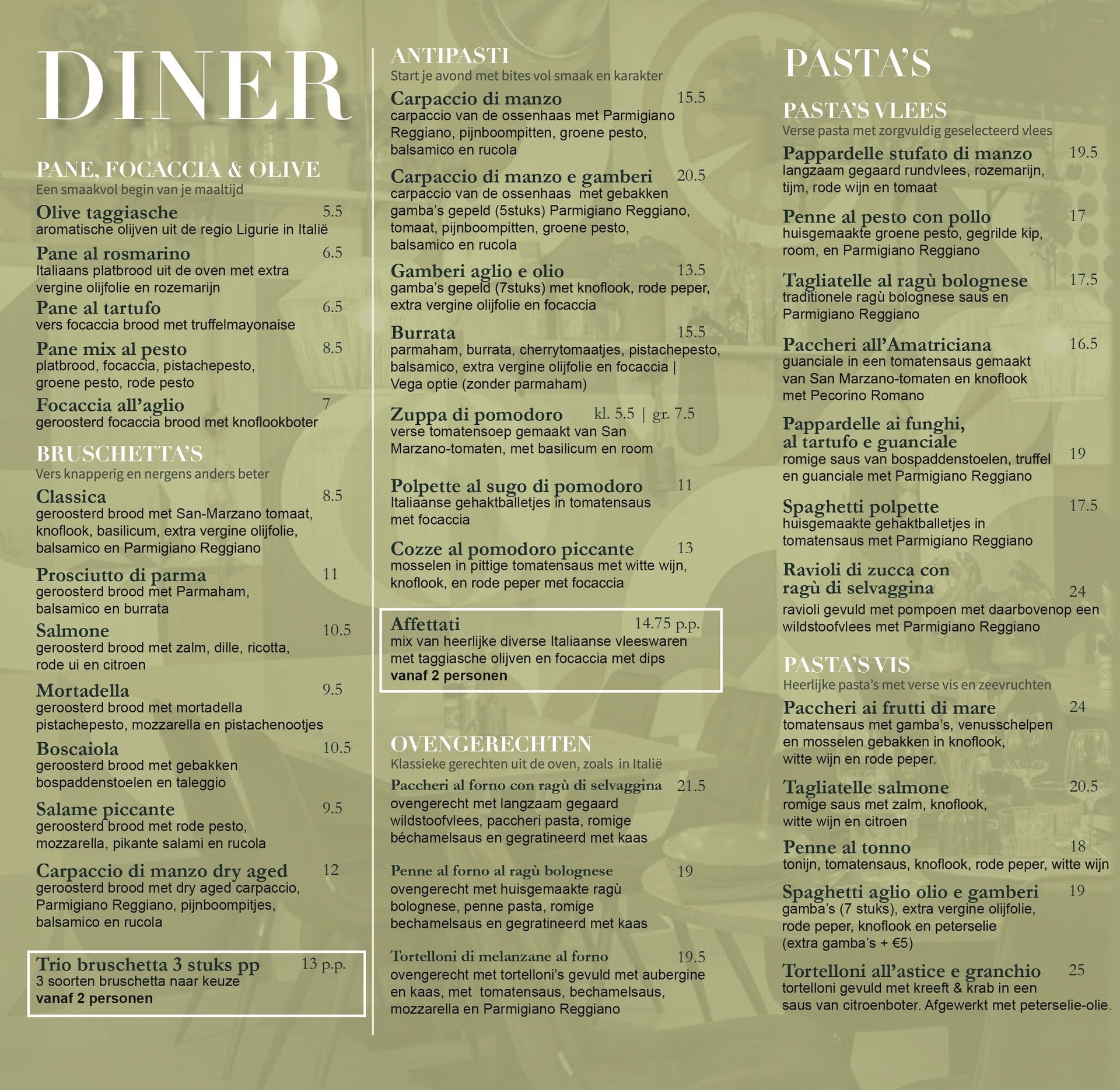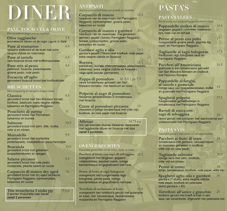 Bestel online via onze website. Van bruschetta en pasta's tot pinsa’s en klassieke tiramisù: ons volledige afhaalmenu staat voor je klaar.